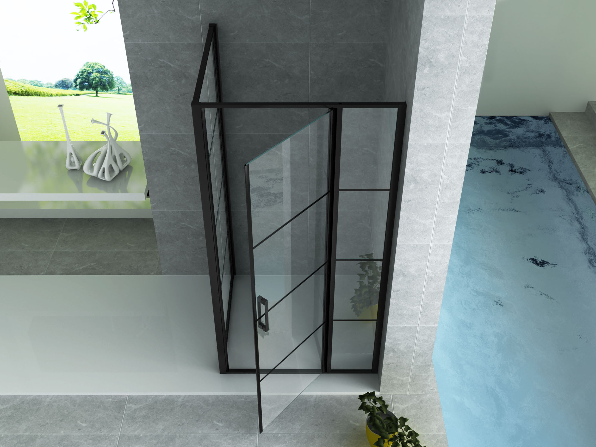 Cabine De Douche Aloni Avec Porte Battante, Panneau Fixe Et Panneau Latéral – Avec Traitement Anti-Calcaire – Réversible – Verre De Sécurité 8mm – 80x120x200 Cm – Noir Mat – Verre Clair Avec Grille Noire