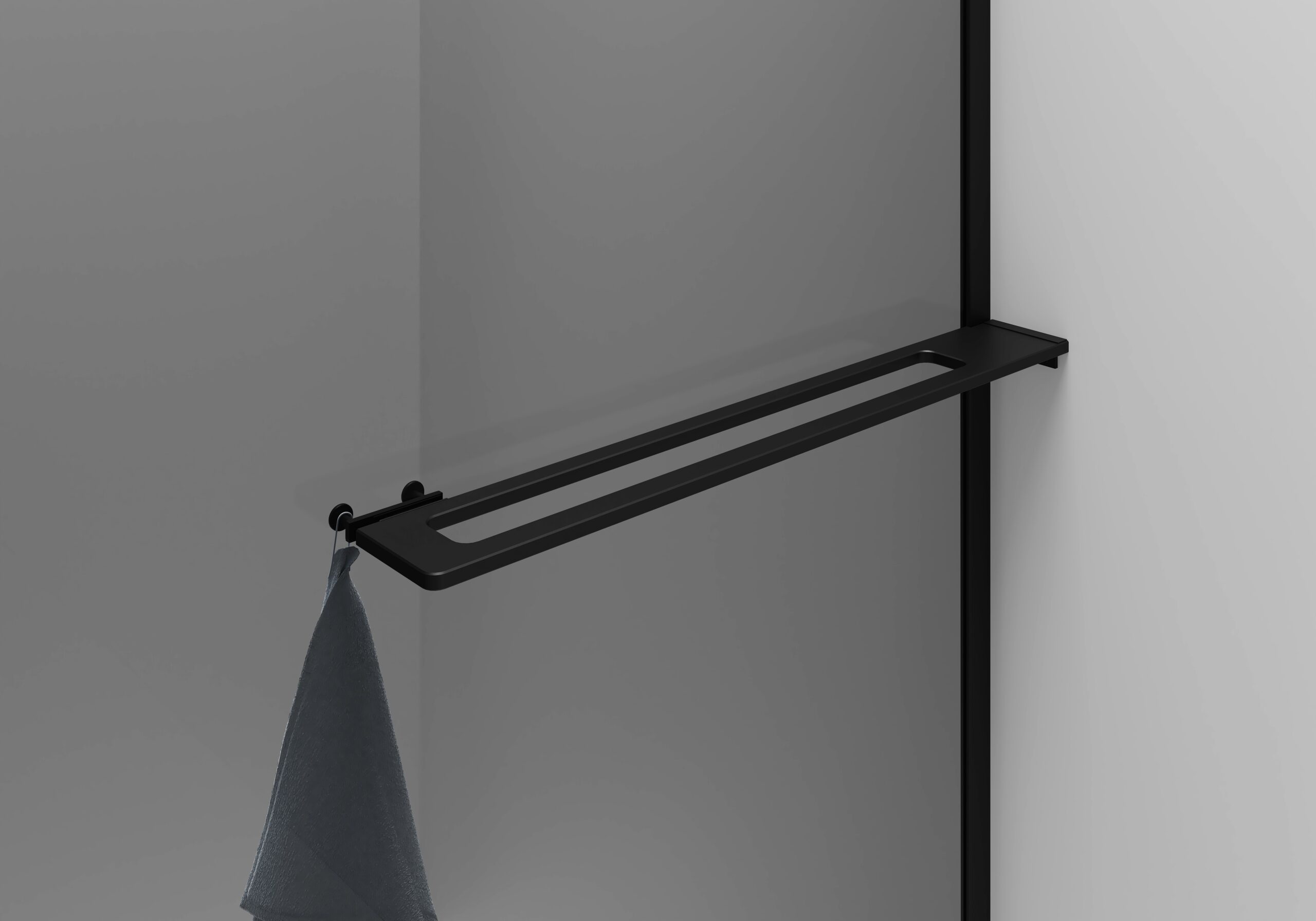 - Multifunctional towel rail/shelf with 2 hooks – can be placed inside or outside the shower wall
