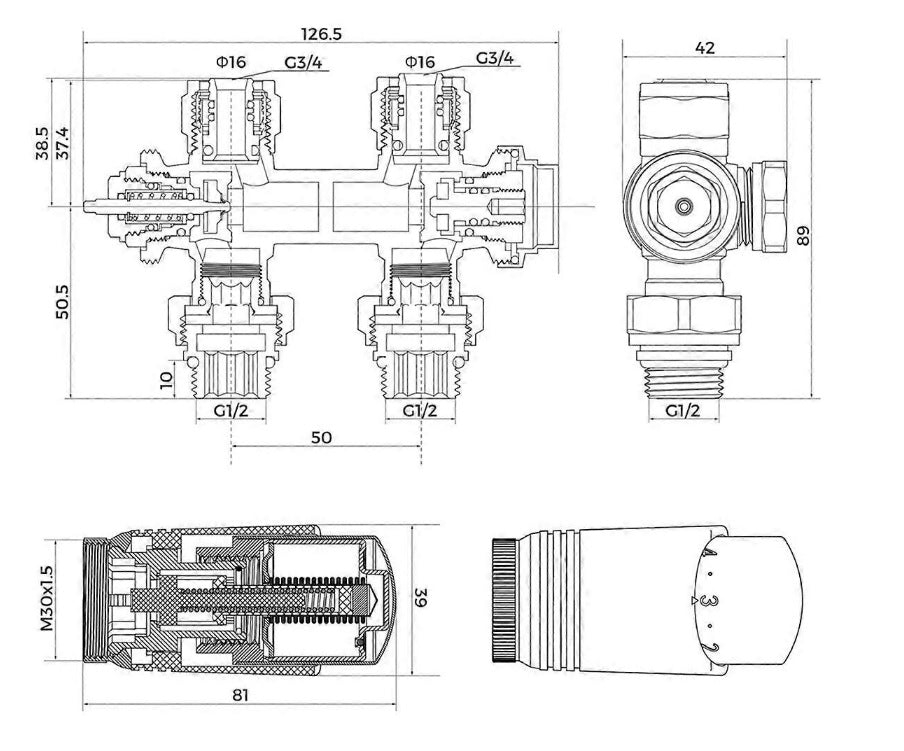 Vanne De Radiateur Erfu – Design – Thermostatique – Raccordement Mur Et Sol – 1/2mx16/2 M30 – Acier Inoxydable Chrome Brossé