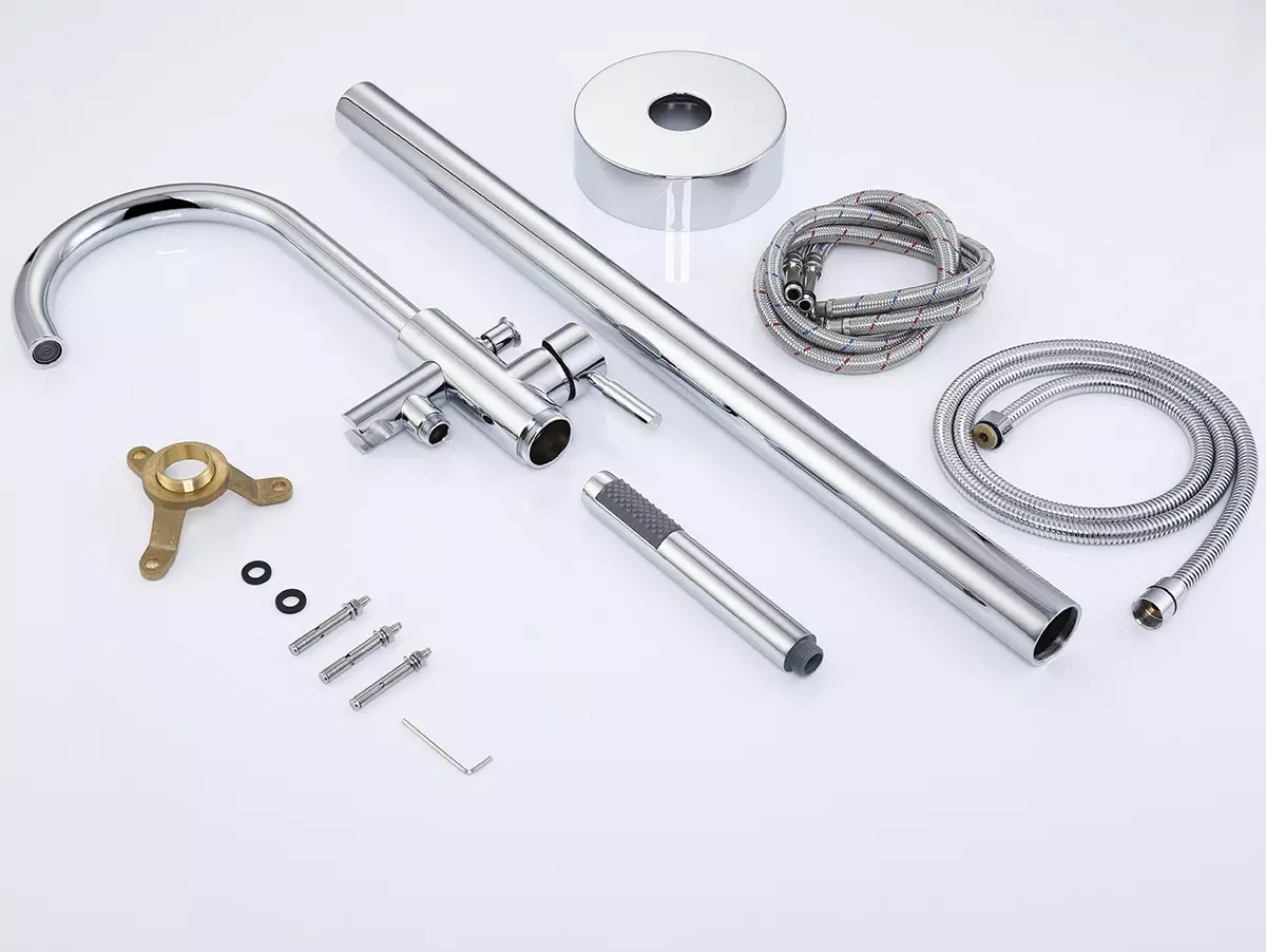This freestanding bath mixer made of RVS, brass and zinc includes a swivel spout, hand shower, single lever, mixer and stable base. The elegant model exudes a sleek and minimalist look. The brushed finish also creates a trendy and industrial design, making this set easy to combine wi