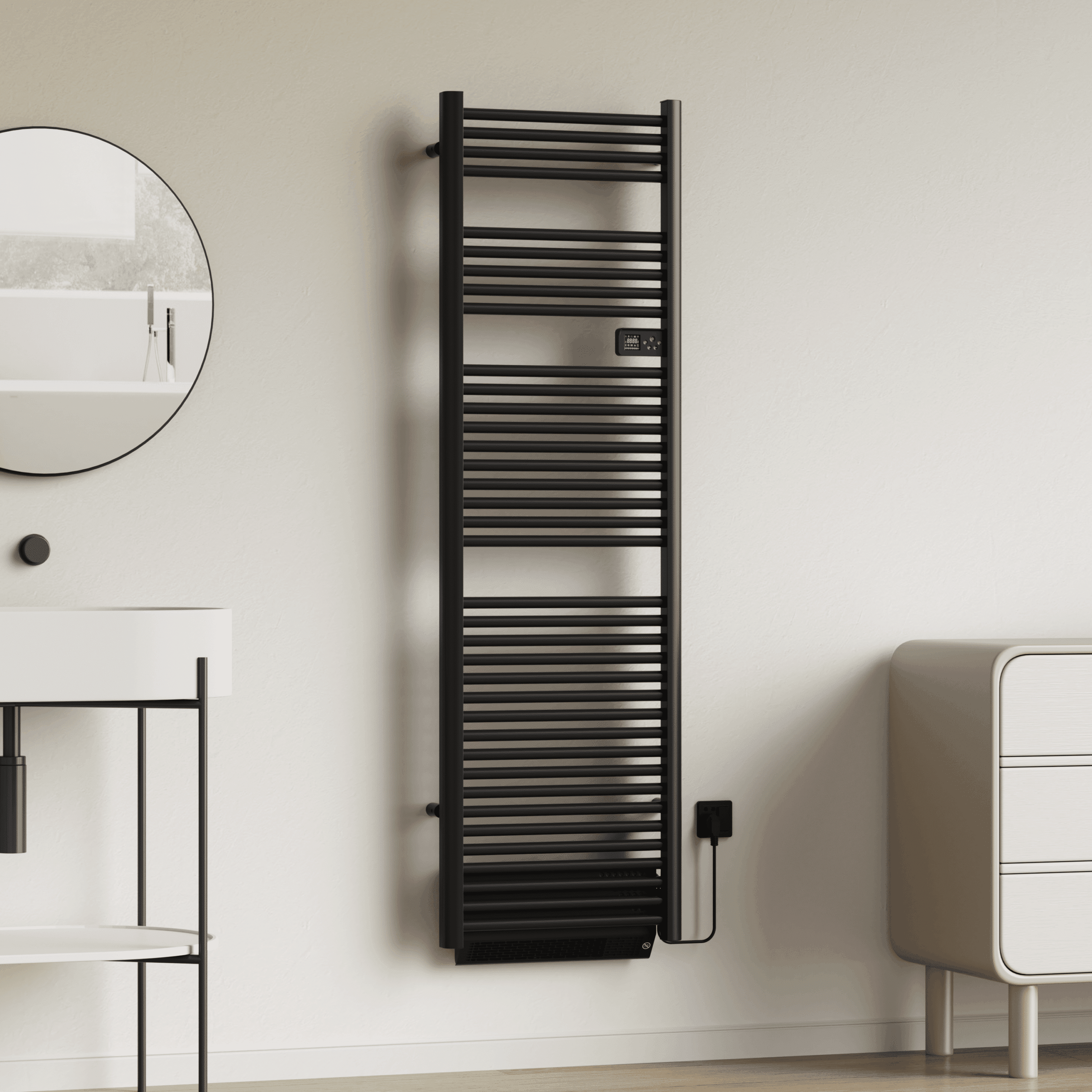 This elegant heater, finished in matt black, features a powerful blower that heats your bathroom quickly and evenly. No drafts, no waiting – just gentle, efficient warmth exactly when you need it. With a temperature range from 7 to 30°C and multiple modes such as Comfort, Eco and Boost, you can easily adjust the operation to suit your daily routine and personal preferences.<br