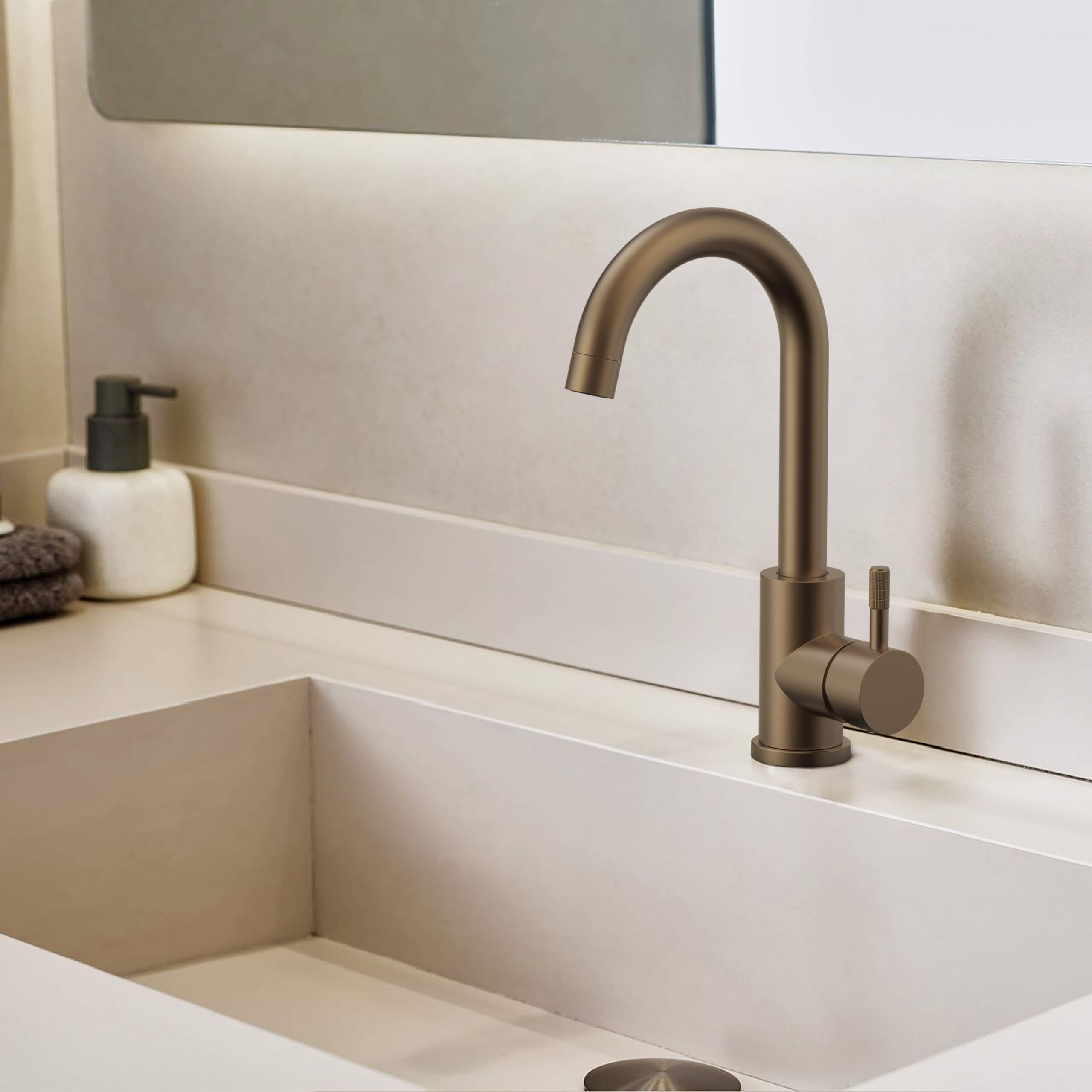 Stria Wastafelmengkraan – Gebogen Uitloop – Draaiende – Koude Start – Handgreep Met Verfijnde Geribde Textuur – Zonder Afval – Bruin Brons (Pvd)