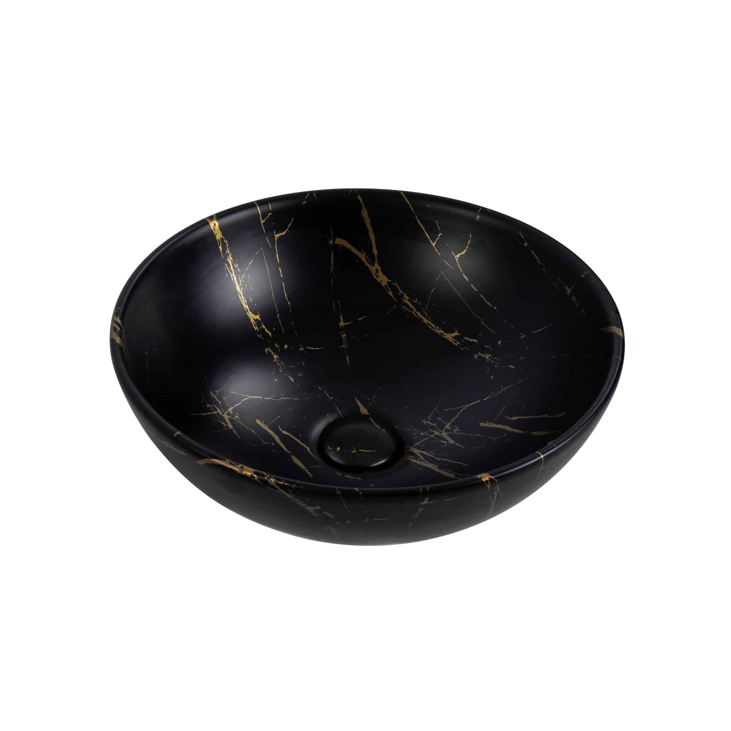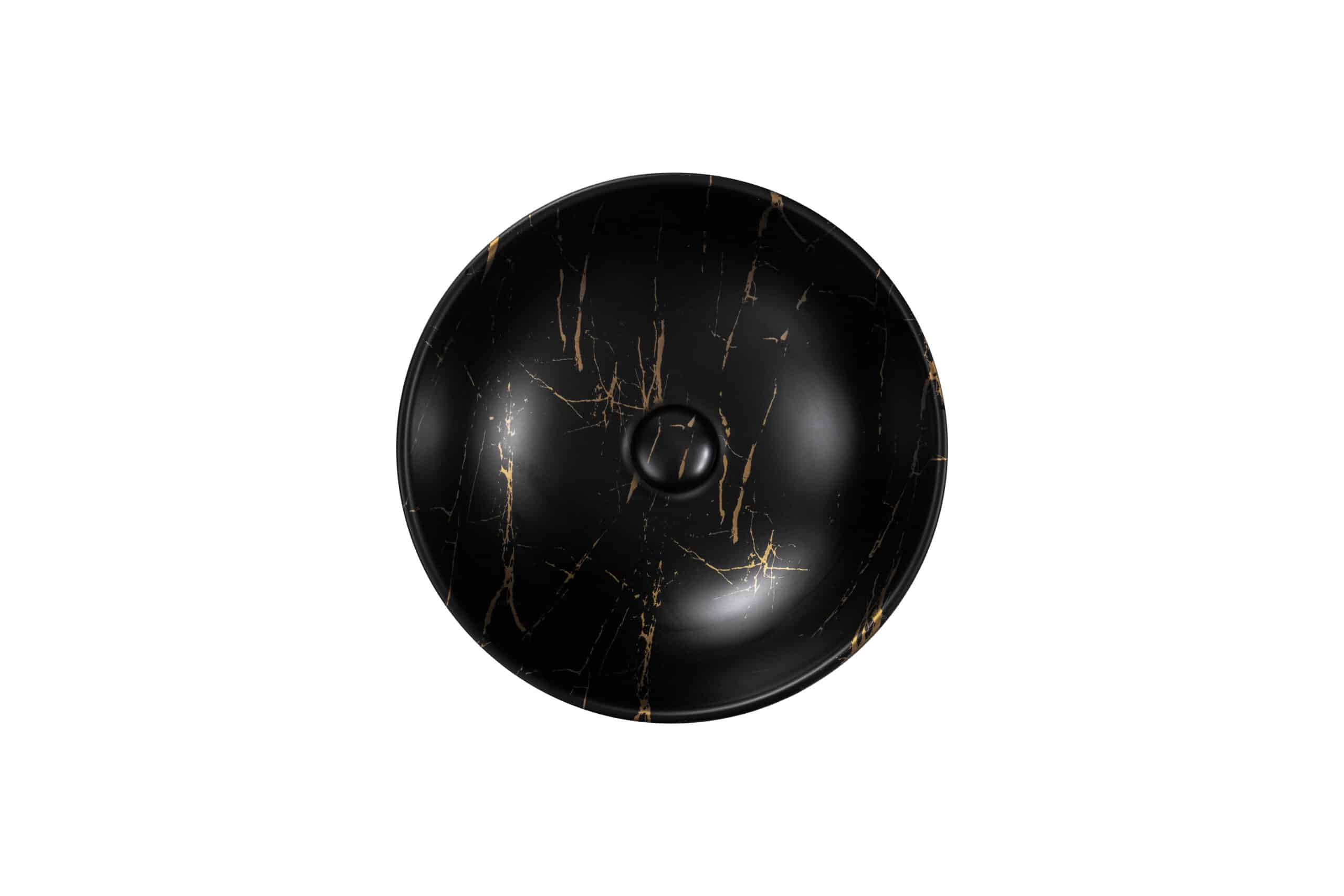 The round, minimalist design without tap hole or overflow creates a clean, modern look, while the matching click waste (also in black/gold marble-look) is included for optimal ease of use.