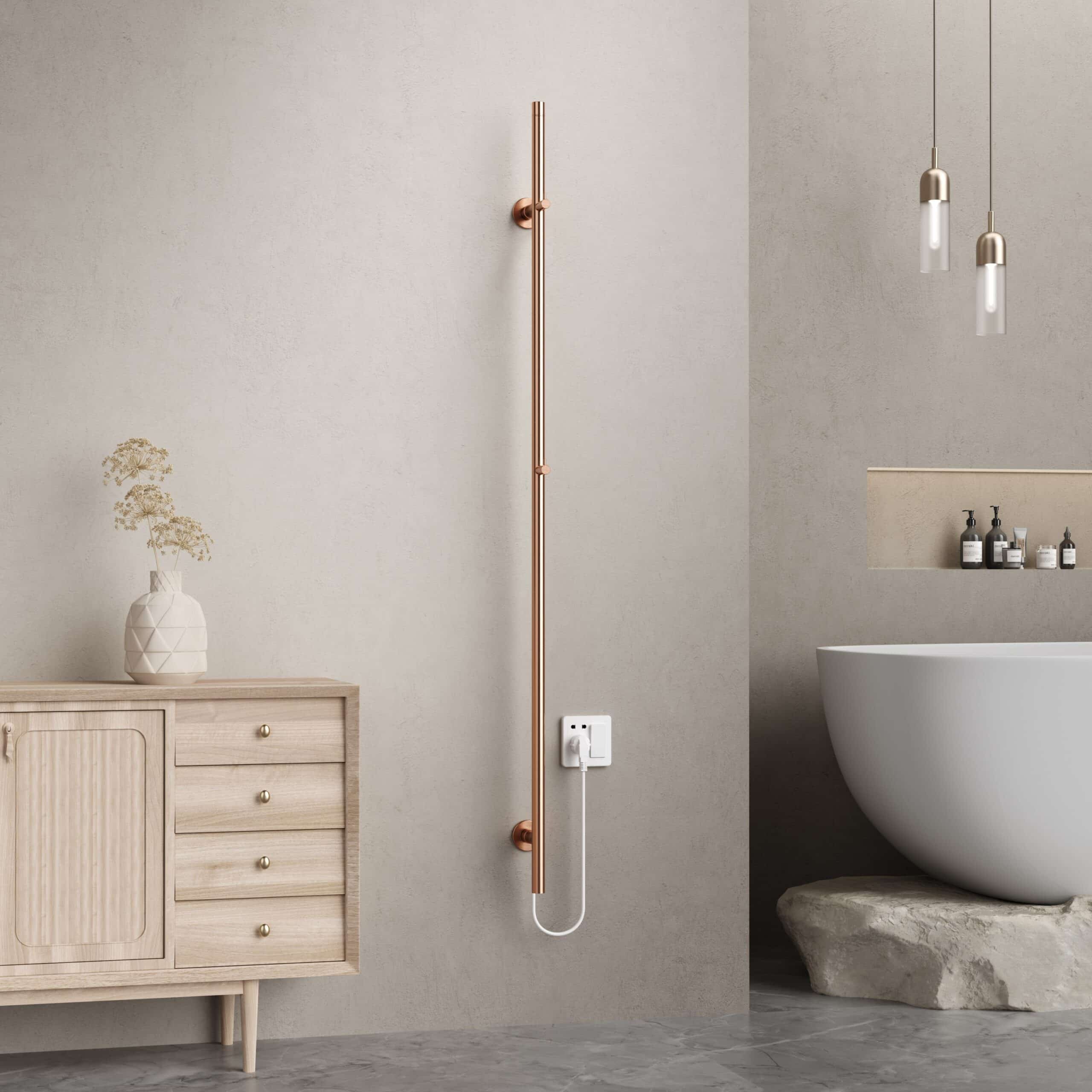 This elegantly designed Belrad single, electric standing towel dryer in brushed copper* is 150 cm high and combines minimalist design with energy efficiency and a heating capacity of 60W. Thanks to the two handy hooks, you can always enjoy a warm towel or bathrobe after showering, without depending on central heating.